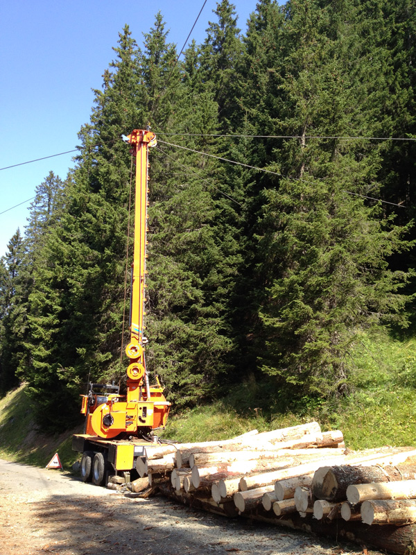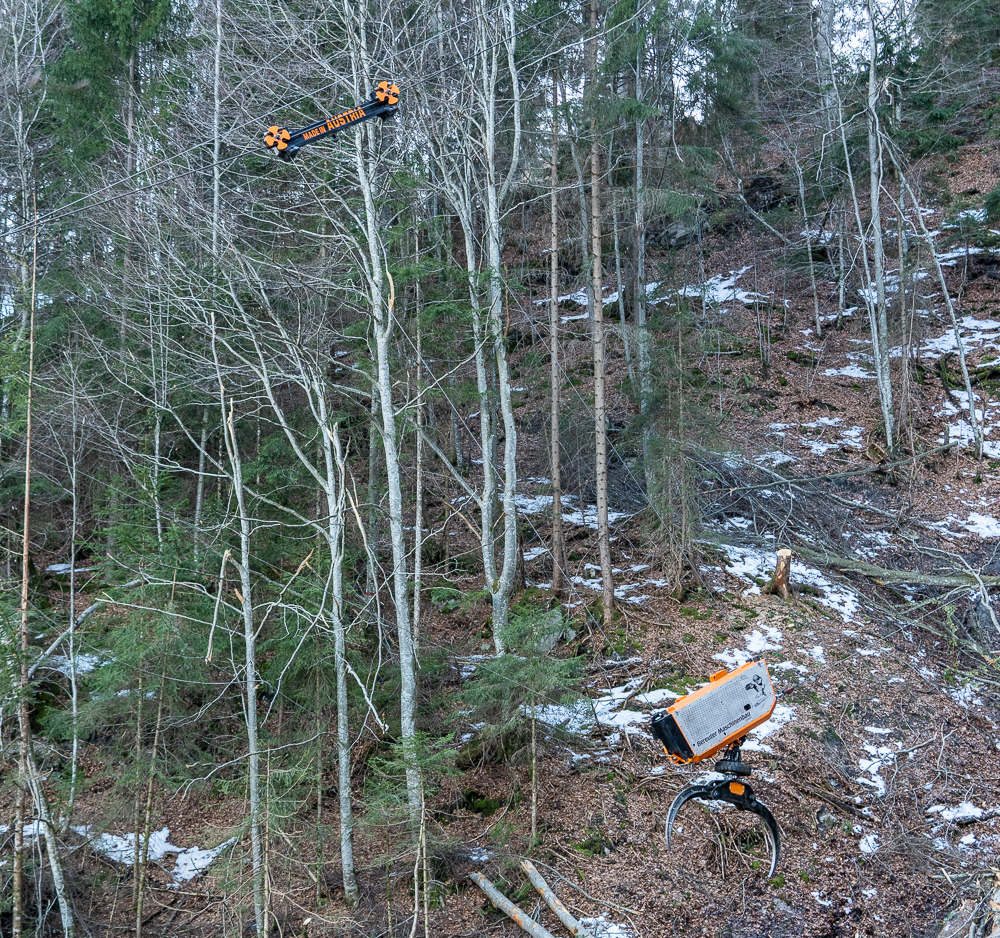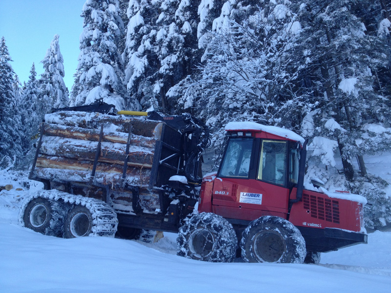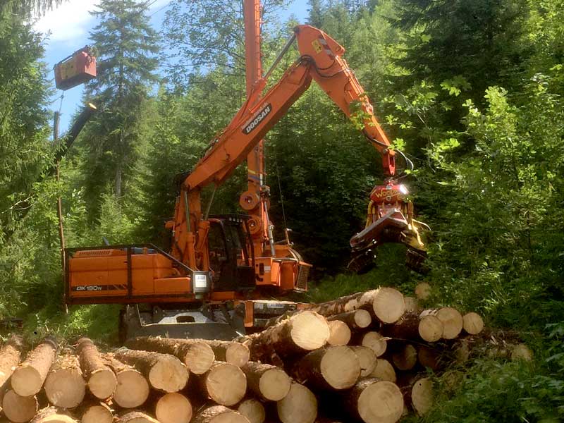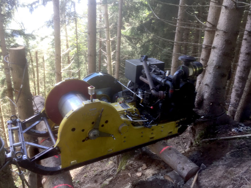 Maschinenpark Timberjack 1470 mit Doppeltrommelseilwinde Funkgesteuert Gewicht 19.5 t Doosan 190 mit Woody 60 Vorwarder Valmet 840.3 Nutzlast 10 t Kotschenreuther 135 Rückekran Doppeltrommelseilwinde LKW Daf 460 3-Achser Kran 14mt mit Greifersäge mit Ginaf-Lenkung Kippmast Synchronfalke 4t Tragseillänge 950m Umlauf 900m Liftliner Greiferlaufwagen Hubkraft 3t Langstreckenseilbahn